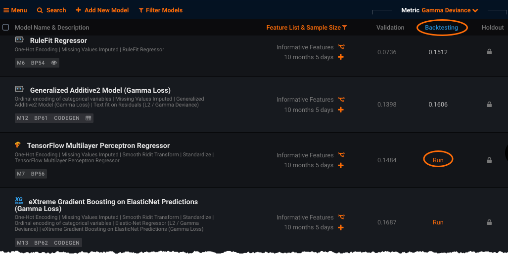 The results of clicking on the backtest name depend on whether backtesting has been run for the model. DataRobot automatically computes backtests for the highest scoring models; for lower-scoring models, you must select Run from the Leaderboard to initiate backtesting: