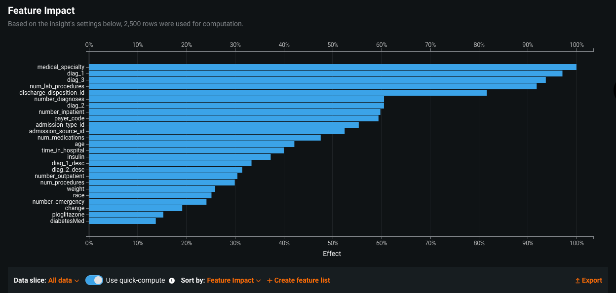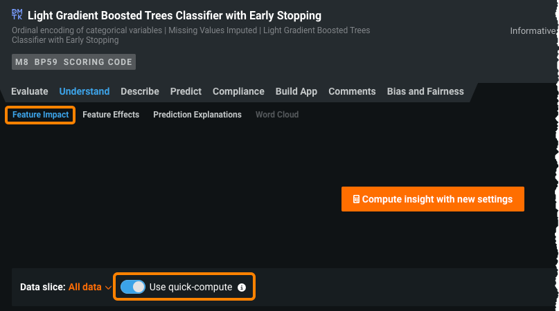 When working with Feature Impact, the Use quick-compute option controls the sample size used in the visualization. The row count used to build the visualization is based on the toggle setting and whether a data slice is applied.