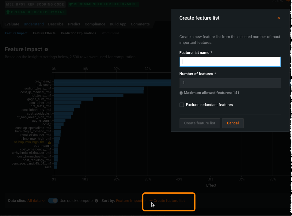 After DataRobot completes the feature impact computation, click Create Feature List.