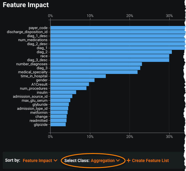 The Aggregation option displays the Feature Impact chart like any other model; it displays up to 25 of the model's most important features, listed most important to least. Select an individual class to see its individual Feature Impact scores on a new chart.