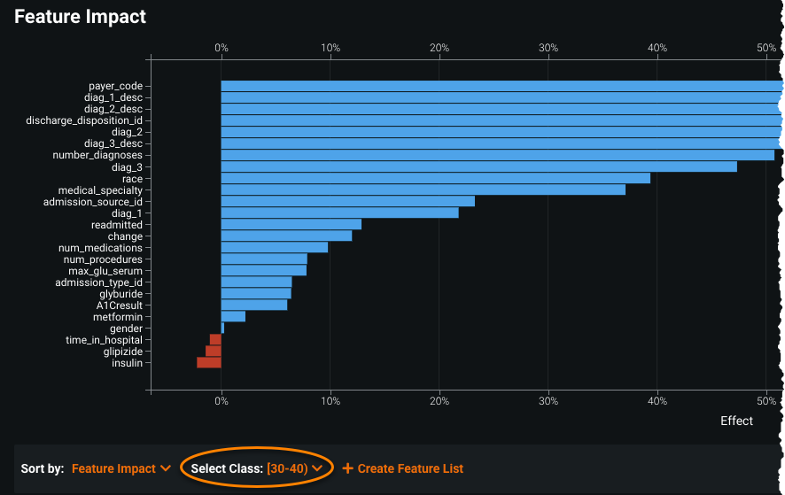 After calculating Feature Impact, an additional Select Class dropdown appears with the chart.