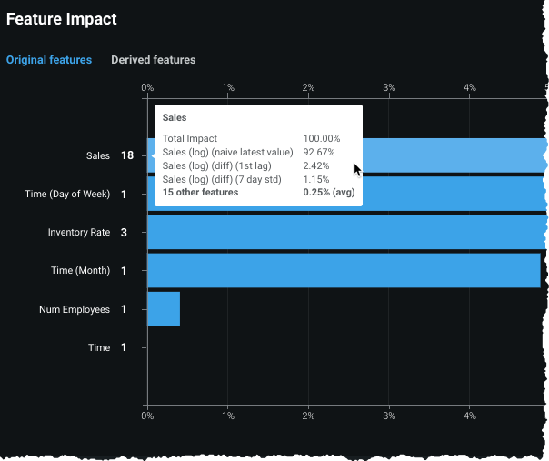 For time series models, you have an option to see results for original or derived features. When viewing original features, the chart shows all features derived from the original parent feature as a single entry. Hovering on a feature displays a tooltip showing the aggregated impact of the original and derived features (the sum of derived feature impacts).