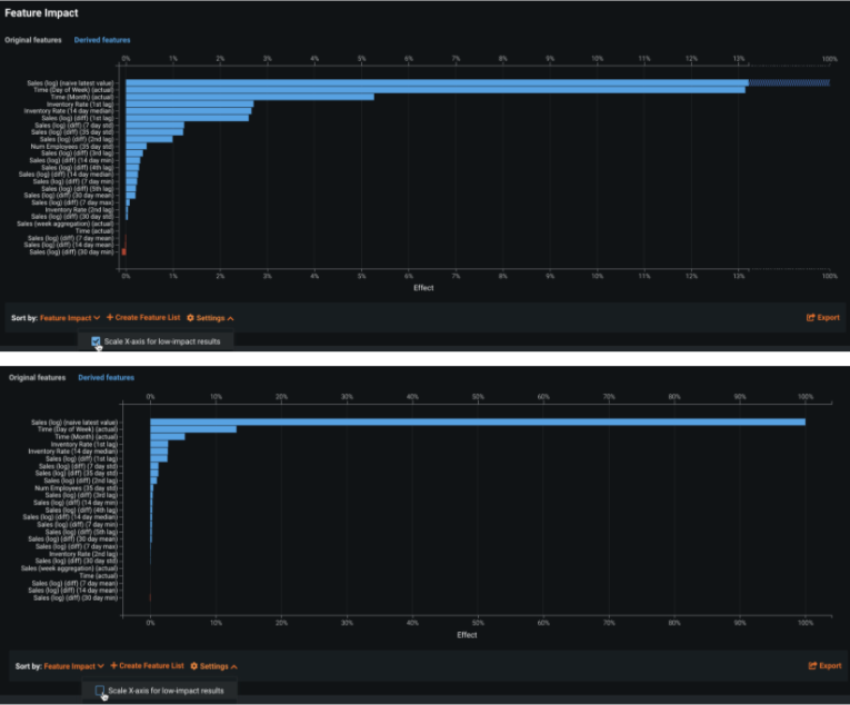 Note that the Settings link is only available if scaling is available. The link is hidden or shown based on the ratio of Feature Impact values (whether they are high enough to need scaling). Specifically, it is only shown if highest_score / second_highest_score > 3.