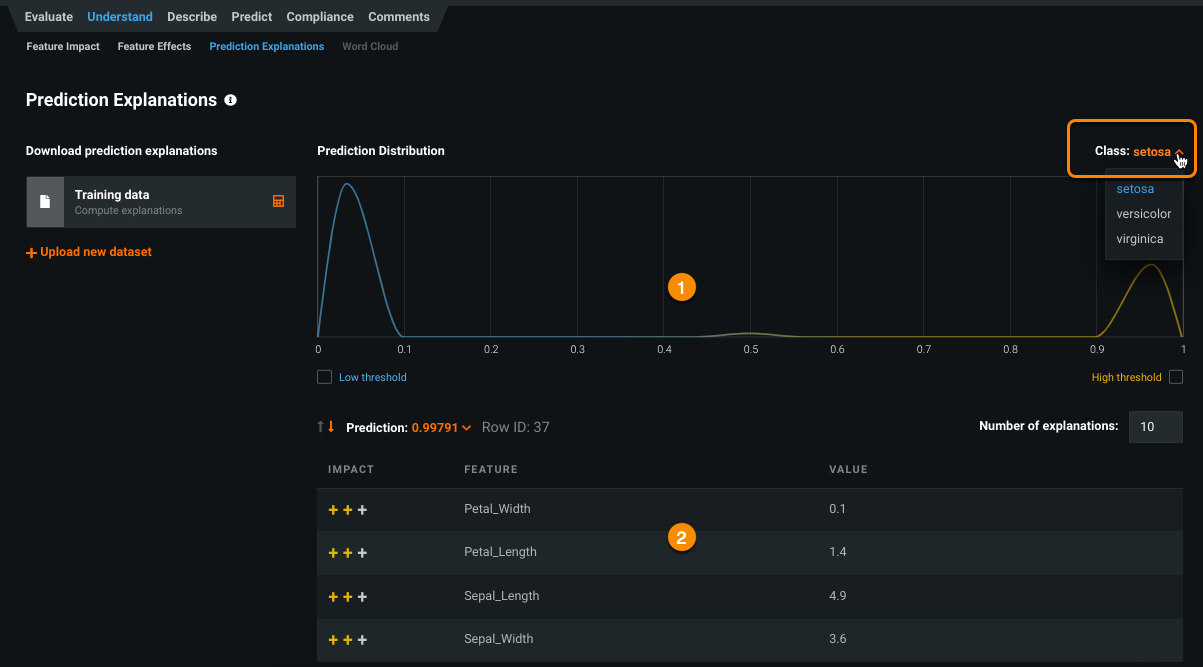 The following steps provide a general overview of using the Prediction Explanations tab with uploaded datasets. You can upload and compute explanations for additional datasets, however.