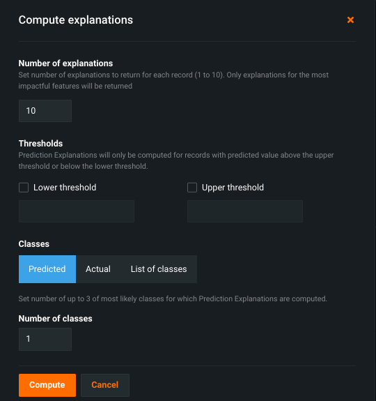 You can apply low and high threshold filters to speed up computation. When at least one is specified, DataRobot only computes Prediction Explanations for the selected outlier rows. Rows are considered to be outliers if their predicted value (in the case of regression projects) or probability of being the positive class (in classification projects) is less than the low or greater than the high value. If you toggle both filters off, DataRobot computes Prediction Explanations for all rows.