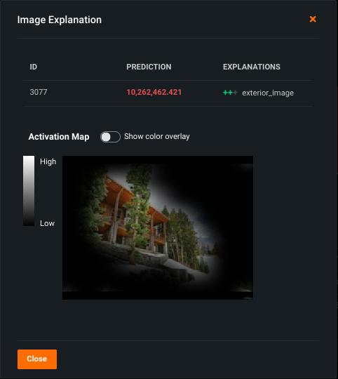 Prediction Explanations for Visual AI projects, also known as Image Explanations, allow you to retrieve explanations for datasets that include features of type "image". Visual AI Image Explanations support all the features described above, with some additions. For explanations size limitations for Visual AI prediction datasets, see the considerations.