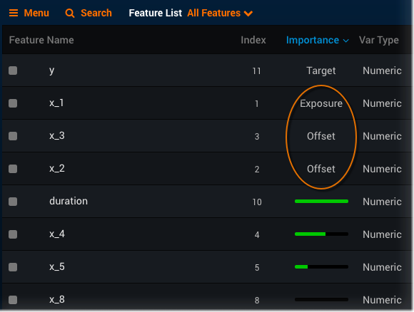 | Offset | Sets feature(s) that should be treated as a fixed component for modeling (coefficient of 1 in generalized linear models or gradient boosting machine models). Regression and binary classification problems only. |