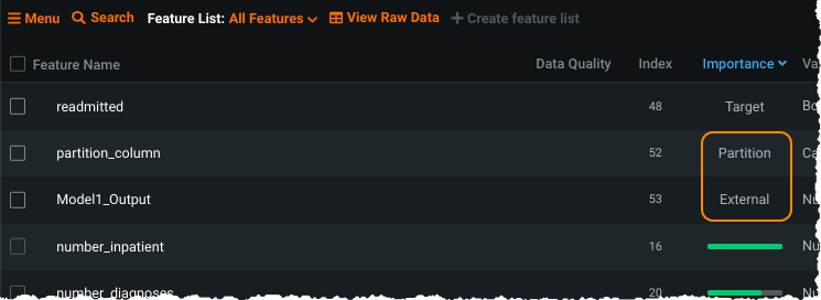 Once EDA2 finishes, open the Data page. In the Importance column, the external model prediction values column,