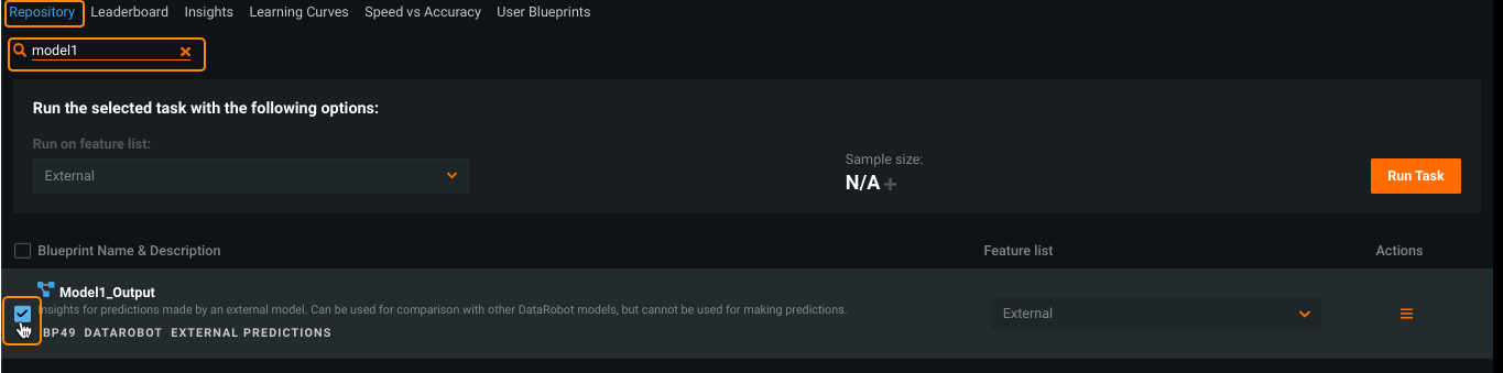 Model1_Output, and select it. Notice in the resulting task setup fields, the feature list and sample size are not available for modification. This is because DataRobot cannot know which features from the training data, or what sample size, were used to train the external model.