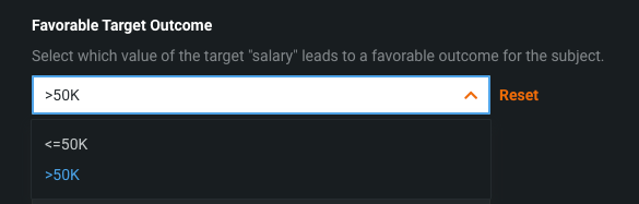 Define the Favorable Target Outcome, i.e., the outcome perceived as favorable for the protected class relative to the target. In the below example, the target is "salary" so annual salaries are listed under Favorable Target Outcome, and a favorable outcome is earning greater than 50K.