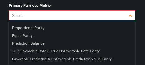 Click Select to add the highlighted option to the Primary Fairness Metric field.