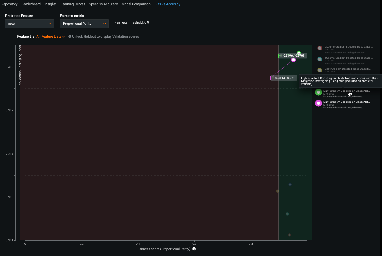 Use the Bias vs Accuracy tab to compare the bias and accuracy of mitigated vs. unmitigated models. The chart will likely show that mitigated models have higher fairness scores (less bias) than their unmitigated version, but with lower accuracy.