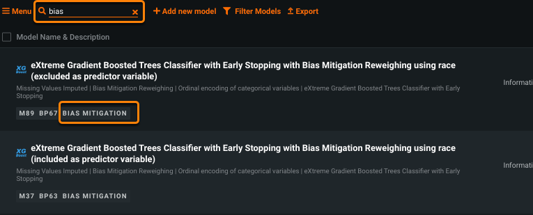 Click Apply to start building new, mitigated versions of the models. When training is complete, the models can be identified on the Leaderboard by the BIAS MITIGATION badge.