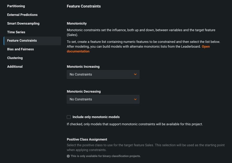 Monotonicity forces a directional relationship between features and the target. Use this tab to apply monotonic feature lists, choose models, and make a positive class assignment.