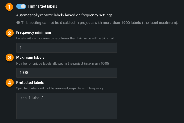 | 1 | Trim target labels | Enables the trimming functionality. When more than 1,000 labels are detected, the selection is on and cannot be changed. If fewer than 1,000 labels, the selection is off by default but can be enabled. |