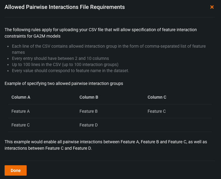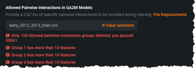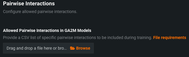 You must provide a CSV file that specifies the pairwise interactions you want to include. Click the File Requirements link for more information about the limitations and format needed for the CSV. The pop-up modal includes an example showing how to structure your CSV in a case that specifies two allowed pairwise interaction groups.