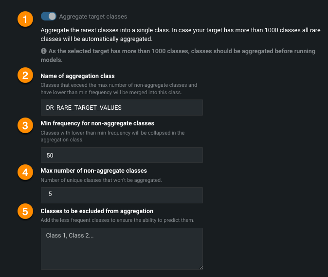 | Aggregate target class | Configures how classes are aggregated for multiclass modeling. |