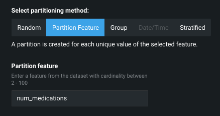 The Partition Feature option creates a 1:1 mapping between values of this feature and validation partitions. Each unique value receives its own partition, and all rows with that value are placed in that partition. Although date cannot be selected as the target for a project, it can be selected as a partition feature. The column or feature you select must have at least two, and no more than 100 values; those with one unique value cannot be used.