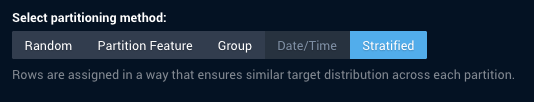 Observations (rows) are randomly assigned to training, validation, and holdout sets, preserving (as close as possible to) the same ratio of values for the prediction target as in the original data. If Run models using is set to Train-Validate-Holdout, each partition is assigned the same ratio. If set to Cross-Validation, the ratio is preserved both 1) across each CV fold and 2) relative to the training partition. This selection is available for zero-boosted regression problems and binary classification problems.
