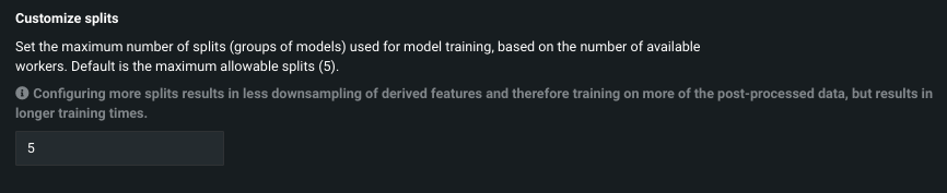 Splits are a group of models that are trained on a set of derived features that have been downsampled. Configuring more splits results in less downsampling of derived features and therefore training on more of the post-processed data. Working with more post-processed data, however, results in longer training times.