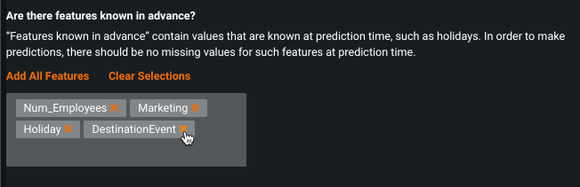Variables for which you know the value in advance (KA) and that do not need to be lagged can be added for different handling from Advanced options prior to model building. You can add any number of original (parent) features to this list of known variables (i.e., user-transformed or derived features cannot be handled as KA). By informing DataRobot that some variables are known in advance and providing them at prediction time, forecast accuracy is significantly improved (e.g., better forecasts for public holidays or during promotions).