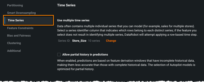 Not all blueprints are designed to predict on new series with only partial history, as it can lead to suboptimal predictions. This is because for those blueprints the full history is needed to derive the features for specific forecast points. "Cold start" is the ability to model on series that were not seen in the training data; partial history refers to prediction datasets with series history that is only partially known (historical rows are partially available within the feature derivation window). When Allow partial history is checked, this option "instructs" Autopilot to run those blueprints optimized for cold start and also for partial history modeling, eliminating models with less accurate results for partial history support.