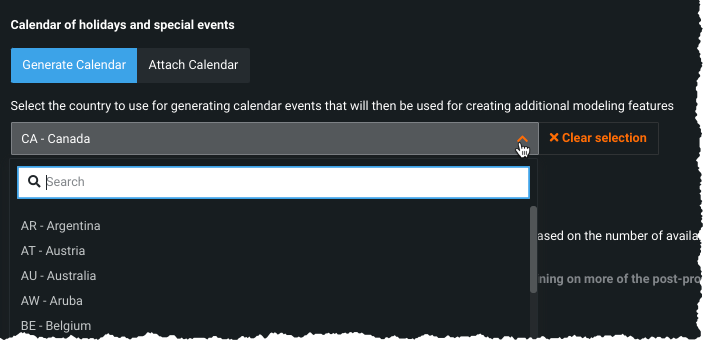 To use a preloaded calendar, simply select the country code from the dropdown. DataRobot automatically generates a calendar that covers the span of the dataset (start and end dates).