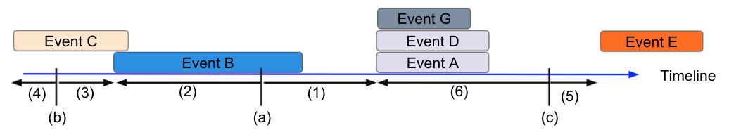 Following are examples of how DataRobot uses event duration and lexical order to handle overlapping events: