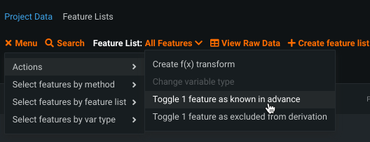 From the EDA1 data table (data prior to clicking Start), check the boxes to the left of one or more features and, from the menu, choose Actions > Toggle x features as... (known in advance or excluded from derivation). To remove a feature, check the box and toggle the selection.