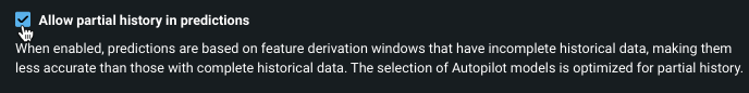 | Allow partial history in predictions | Allow predictions that are based on feature derivation windows with incomplete historical data. |