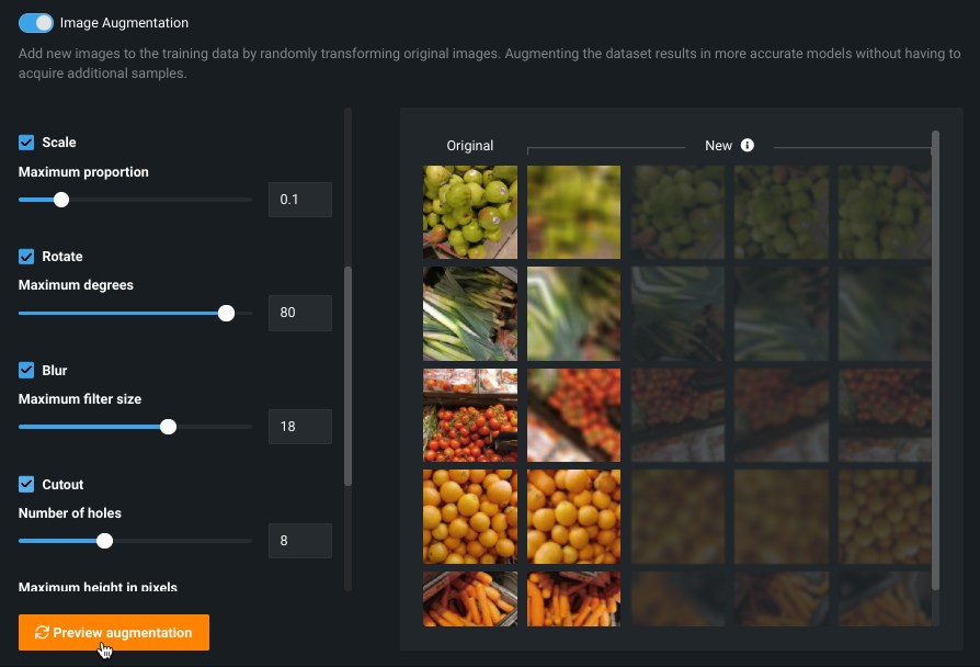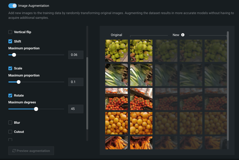 You can continue to modify settings, clicking Preview augmentation to view a sample of results: