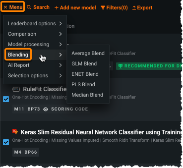 Click the model menu icon at the top left of the Leaderboard, then select one of the blending options listed under Blending. (Hovering over a menu item displays a description of the blending option.)