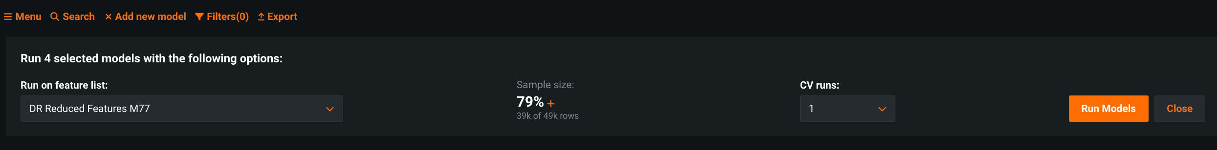 Use the resulting box at the top of the Leaderboard to specify a feature list, sample size, and/or number of cross-validation (CV) runs.