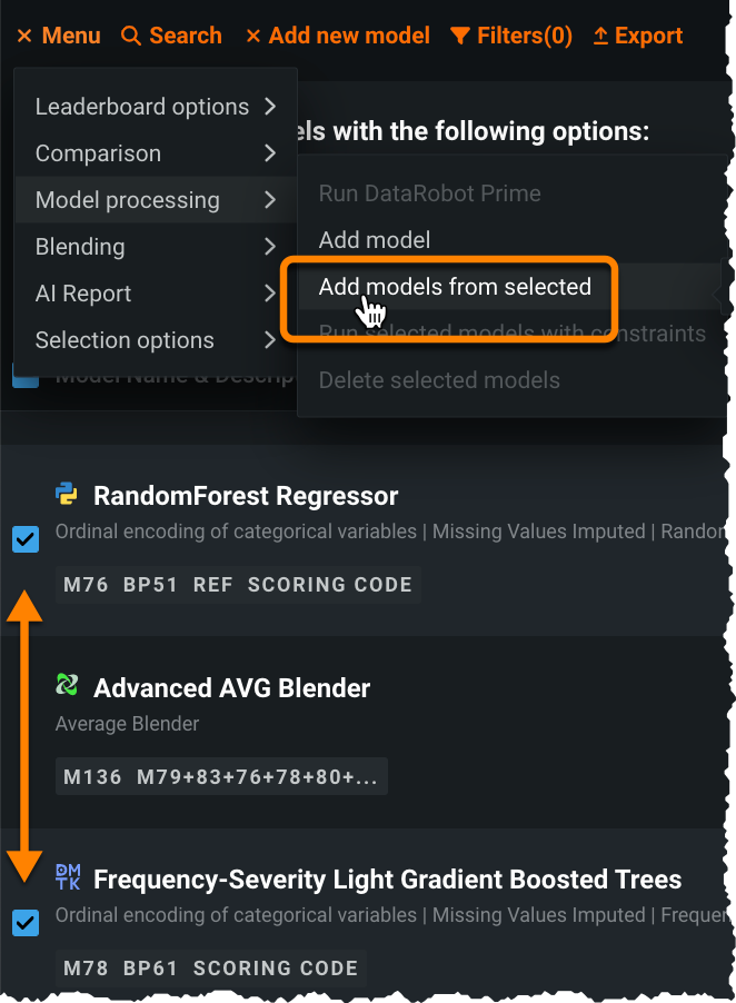 Using the checkboxes on the left side of the model Leaderboard, select two or more models. (See the note on single-model blenders, above, to use blending as an additional calibration method.)