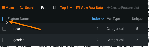 Clicking a feature list name causes DataRobot to select all features on the displayed page that are members of the chosen feature list (set by the Feature List dropdown).