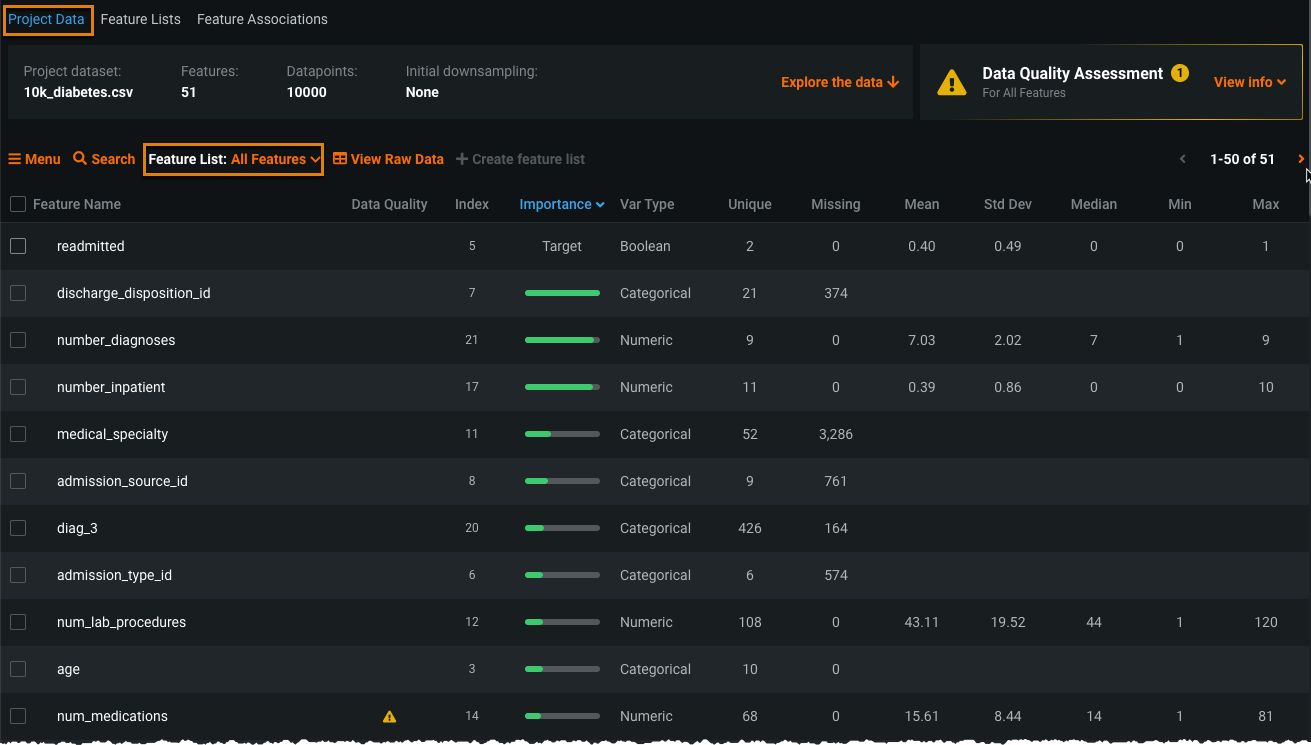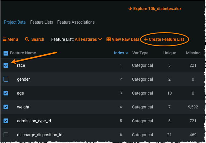 Note that the Project Data tab defaults to showing All Features, which is not actually a feature list but instead a way to view every feature in the dataset.
