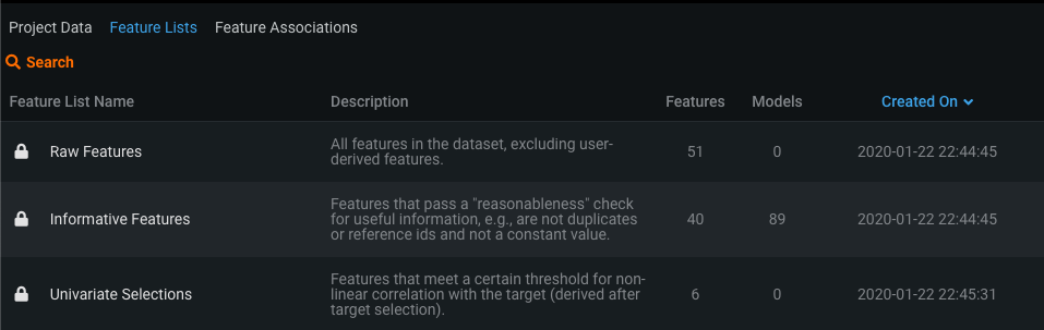 The Feature Lists tab of the the Data page provides a mechanism for managing feature lists. It provides a summary (name, number of features, number of models, created date, and description) of DataRobot-created and custom feature lists and allows you to delete or rename (some) lists to help avoid clutter and confusion. A lock(