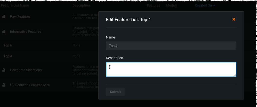 Click + Create feature list and enter the new feature list name to save your custom feature list. The new list is available for selection across the project (from the Feature List dropdown).