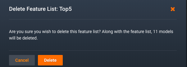 next to the name). If you click to delete a custom feature list that has been used for modeling, DataRobot warns with the number of models impacted: