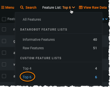 If you do not want to use one of the automatically created feature lists, you can create customized feature lists and train your models on them to see if they yield a better model. You can create these lists from the Data page or the menu. Additionally, you can create lists based on feature impact from the Feature Impact tab, including lists with redundant features removed. You can later manage these lists from the Feature Lists tab.