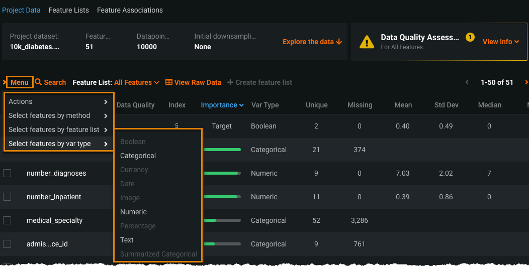 DataRobot provides several tools for working with feature lists. Depending on how the list was created (automatically by DataRobot or manually by a user), or whether it has been used to create models on your Leaderboard, the actions may behave differently:
