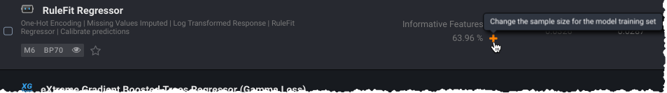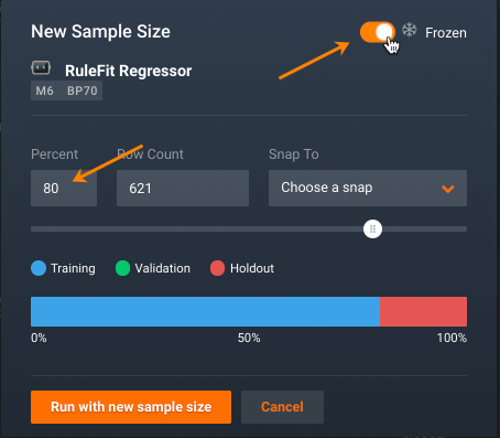 To avoid costly runs for large (over 1.5GB) datasets, you can only launch sample percentage changes to a Leaderboard model as a frozen run. If you are using Smart Downsampling, the threshold applies to the size of the dataset after subsampling.