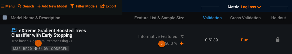- Snowflake (1): The icon and percentage indicate that the model was based on “frozen” parameter settings from the 64% sample size version of the model.