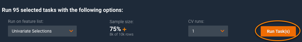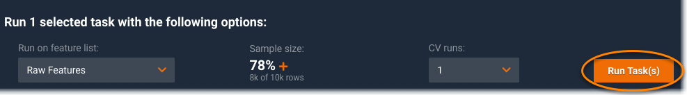 If you have already built any of the models in the batch using the same sample size and feature list, you must make a change to at least one of the parameters (described in the run option). This is not required for batches containing all new models. Click Run Task(s) to start the build.