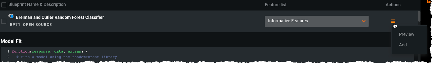 Use the menu to preview a model—either the blueprint or, for open-source models, the code.