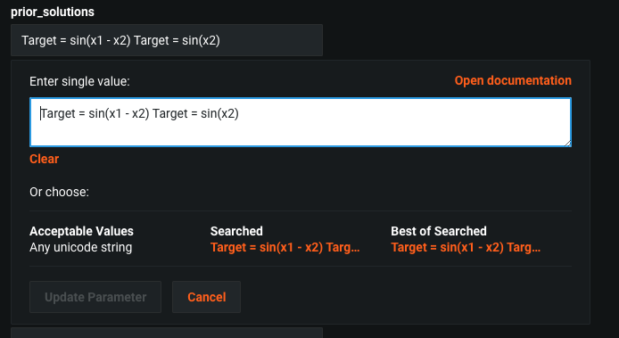 The following shows an example of two prior solutions (expressions), sin(x1 - x2) and sin(x2), set for a model: