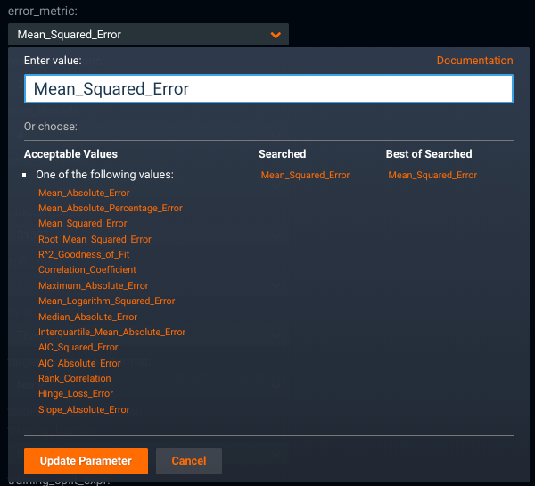 The Error Metric parameter, error_metric, is available within the Prediction Model Parameters and can be modified as part of tuning your Eureqa models. Available error metrics are listed for selection.