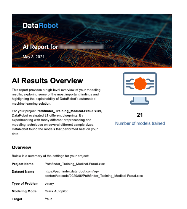 Once you complete an Autopilot run, you can generate an AI Report, which communicates the most important findings of your modeling project to stakeholders. The AI Report provides a high-level overview of your modeling results and insights, with particular focus on Trusted AI insights that fall under the dimensions of quality, accuracy, and interpretability.