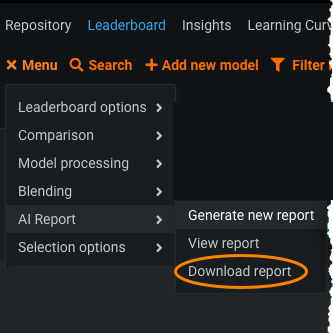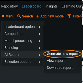 To generate an AI Report for your Autopilot run, on the Leaderboard, click Menu and select AI Report > Generate new report.