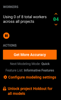 After modeling is complete, you can rerun Autopilot at the next level ("Get More Accuracy"), configure modeling settings and rerun the project, and unlock project holdout.
